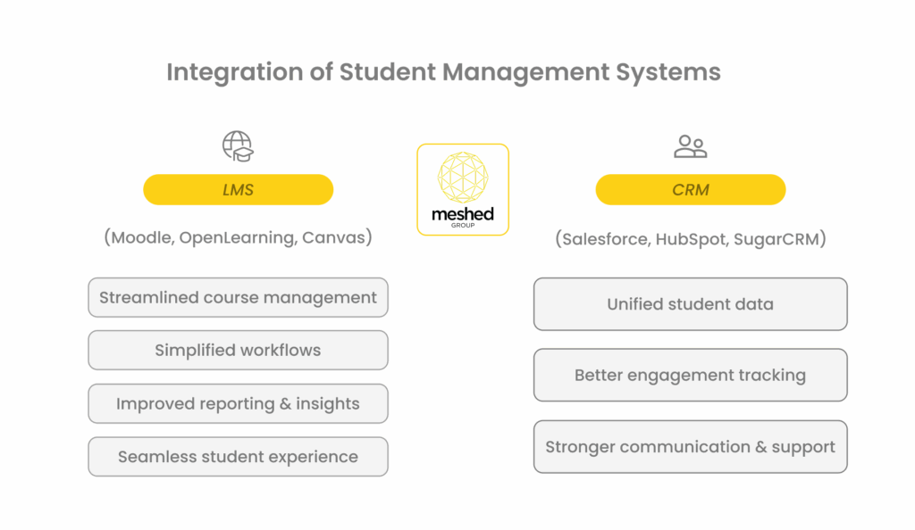 Integrating student systems with CRMs such as Salesforce or HubSpot is becoming increasingly common in higher education. Universities and colleges use these tools to manage processes throughout the student journey, from marketing and admissions to alumni relations and support. When an SMS is integrated with a CRM, contact and communication information is transferred smoothly between the two systems. Today, many Australia-based SMS providers offer ready-made integration solutions for popular CRMs. For example, Meshed’s platform can connect with Salesforce, HubSpot, and SugarCRM. With this setup, when a prospective student’s details are entered into the CRM and they enroll, the data can be transferred into the SMS. This prevents duplicate data entry and ensures records remain consistent.